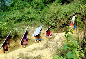 Từ nguồn vốn giai đoạn 2 Chương trình 135 nhân dân thôn Sảng Pả, thị trấn Phong Hải (Bảo Thắng, Lào Cai) được cấp tấm lợp sửa chữa nhà ở. Ảnh: Hữu Tưởng
