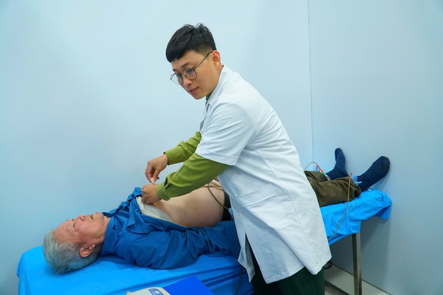 Quân y Tổng cục Công nghiệp Quốc phòng đo điện tim và tư vấn sức khỏe cho người dân.
