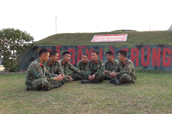 Trung sĩ Sùng Văn Hồng (thứ ba, từ phải sang) trò chuyện với các chiến sĩ trong khẩu đội. |