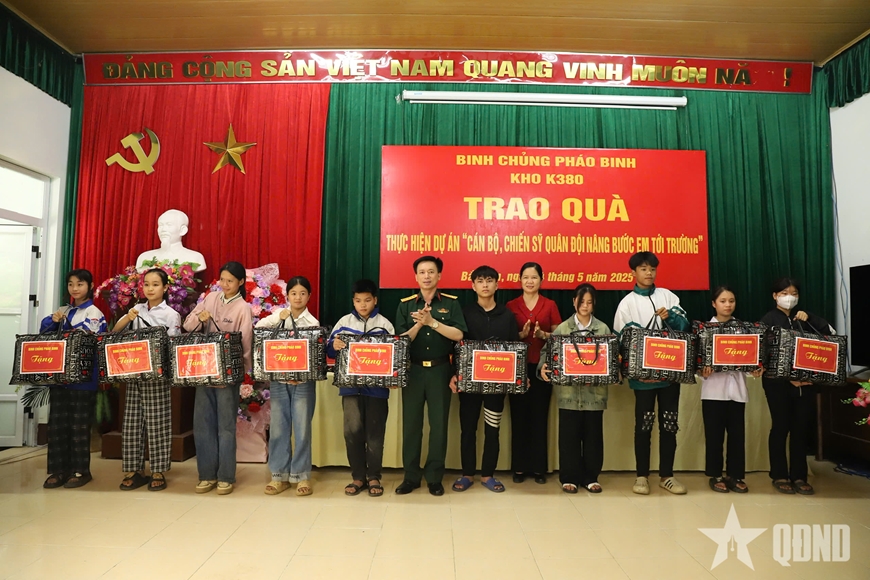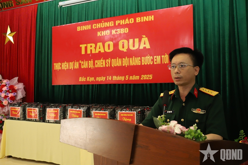 Phát biểu tại buổi trao quà, Đại tá Kiều Trịnh Thái, Phó chủ nhiệm Chính trị Binh chủng Pháo binh cho biết, ngoài nhiệm vụ huấn luyện, sẵn sàng chiến đấu, Binh chủng Pháo binh nói chung, Kho K380 nói riêng luôn quan tâm chia sẻ, trao gửi tình thương yêu đến các em học sinh nghèo có hoàn cảnh khó khăn nơi đơn vị đóng quân, để các em có điều kiện đến trường, thực hiện ước mơ, hoài bão của mình trong tương lai.