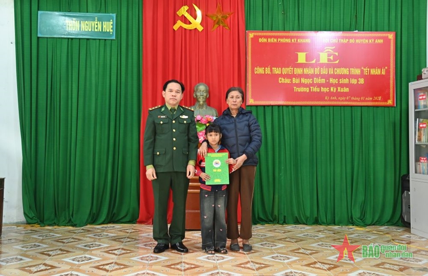 Sáng 7-1, Đồn Biên phòng Kỳ Khang (BĐBP tỉnh Hà Tĩnh) đã nhận đỡ đầu em Bùi Ngọc Diễm, học sinh lớp 3B, Trường Tiểu học Kỳ Xuân, huyện Kỳ Anh, có hoàn cảnh đặc biệt khó khăn.