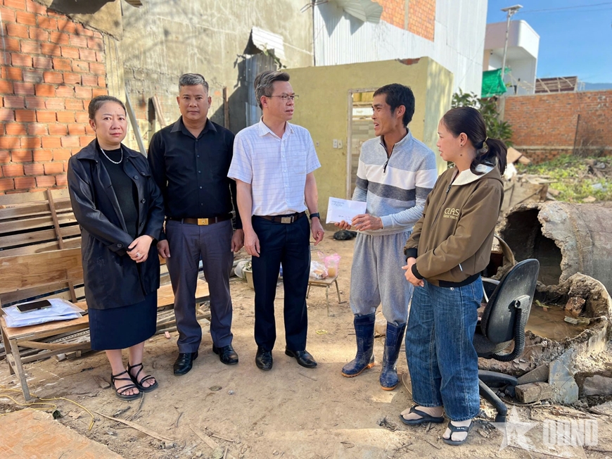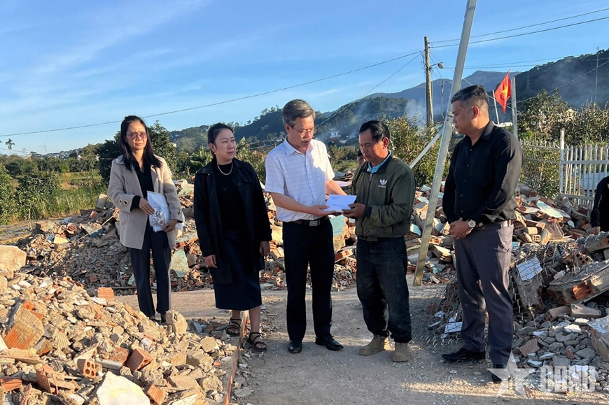 | Lãnh đạo xã D'ran trao kinh phí hỗ trợ người dân xây nhà sau lũ. |