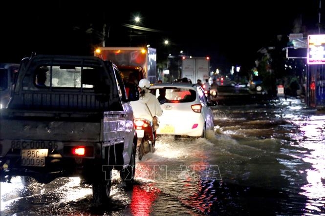 Theo đó, đường Quốc lộ 1A đoạn qua phường Hàm Thắng nhiều đoạn bị ngập sâu, các phương tiện không thể lưu thông. Để đảm bảo an toàn, lực lượng chức năng phong tỏa tuyến đường không cho các phương tiện lưu thông. Cùng với phường Hàm Thắng, tuyến quốc lộ 1A qua địa bàn xã Hồng Sơn, xã Lương Sơn cũng bị ngập khiến các phương tiện không thể lưu thông. Tại Quốc lộ 28 đoạn qua địa bàn xã Hàm Liêm cũng bị ngập, các phương tiện lưu thông khó khăn; nhiều xe mô tô bị chết máy do ngập nước.