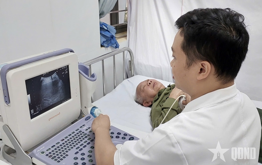 | Bác sĩ siêu âm cho người có công tại buổi khám bệnh. |