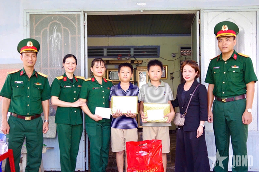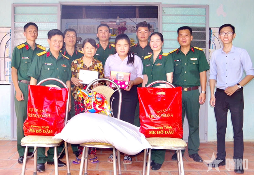 | Cán bộ Trung đoàn 4, Sư đoàn 5 phối hợp tặng quà cho trẻ mồ côi trong chương trình "Mẹ đỡ đầu" tại Tây Ninh. |