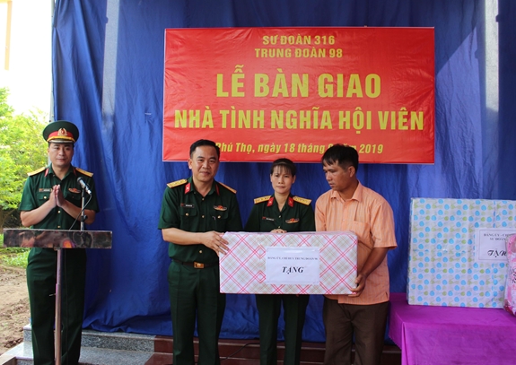 Chỉ huy Trung đoàn 98 (Sư đoàn 316) tặng quà gia đình Đại úy QNCN Đặng Thị Phương Thúy tại lễ bàn giao nhà mới. |