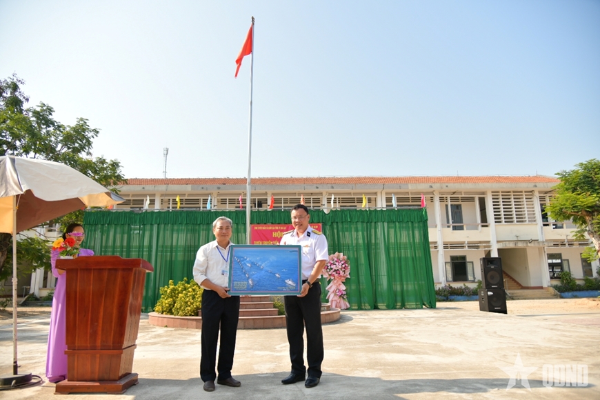 Đoàn công tác Lữ đoàn 955, Vùng 4 Hải quân trao bức ảnh diễu binh trên biển tặng Trường THPT Phù Cát số 3.