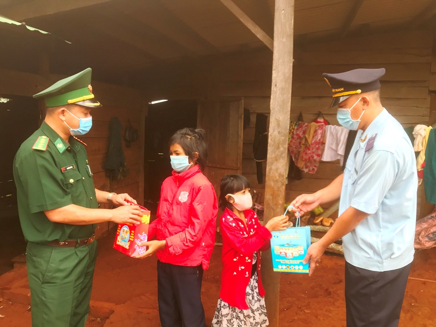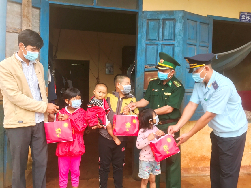 | Đồn Biên phòng cửa khẩu Bu P’răng phối hợp với Chi cục Hải Quan cửa khẩu Bu P’răng mang quà Trung thu lên tặng các cháu. |