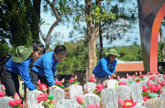 Các đoàn viên thắp hương trên phần mộ các anh hùng liệt sĩ tại Nghĩa trang Liệt sĩ Quốc gia Trường Sơn.