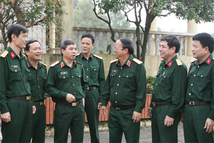 | Trung tướng Đào Duy Minh, Phó chủ nhiệm Tổng cục Chính trị (thứ ba từ phải sang) trao đổi kinh nghiệm việc triển khai thực hiện Quyết định 62 với Ban Chỉ đạo 24 Quân khu 3. Ảnh: Đức Dục. |