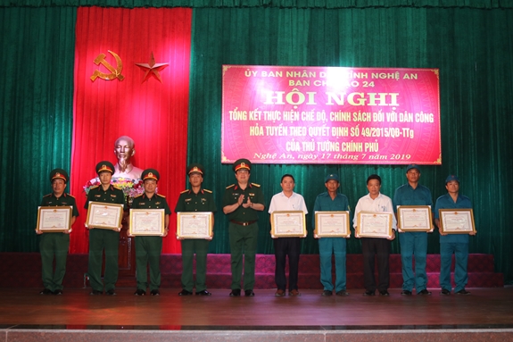 Bộ CHQS tỉnh Nghệ An đã tiếp nhận 206.615 hồ sơ, đã xét duyệt và báo cáo Quân khu 198.611 hồ sơ. Quân khu 4 đã ký Quyết định hưởng trợ cấp 1 lần cho 187.670 trường hợp với số tiền gần 431.419.200.000 đồng; lập danh sách mua và cấp thẻ bảo hiểm y tế, giải quyết chế độ mai táng phí đúng quy định.