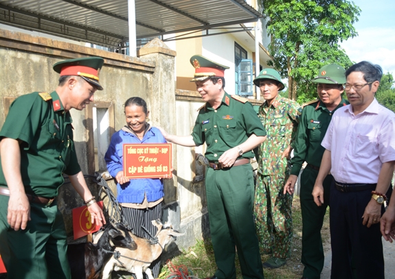 Lãnh đạo Tổng cục Kỹ thuật cùng đại diện chính quyền địa phương trao dê giống tặng các hộ gia đình khó khăn của xã Hướng Hiệp. |