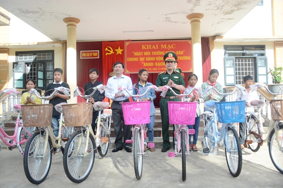 Lãnh đạo Tổng cục Kỹ thuật cùng đại diện chính quyền địa phương trao xe đạp tặng học sinh nghèo vượt khó xã Hướng Hiệp. |