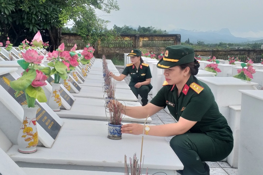 | Hội viên phụ nữ Bộ CHQS tỉnh Tuyên Quang thắp hương tại Nghĩa trang Liệt sĩ Quốc gia Vị Xuyên (Hà Giang). Ảnh: MINH NGHĨA |