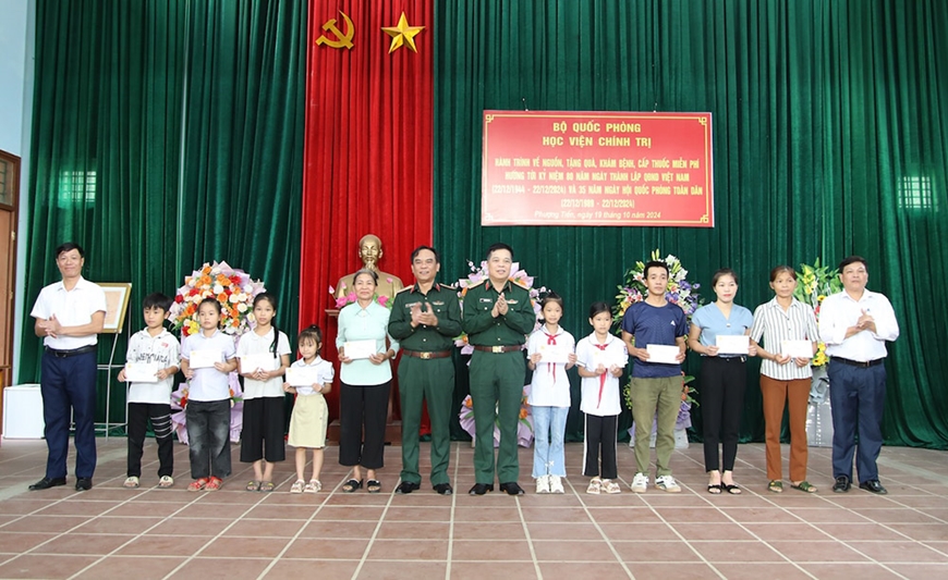 | Lãnh đạo Học viện Chính trị trao quà tặng các gia đình chính sách, gia đình có hoàn cảnh khó khăn tại xã Phượng Tiến (Định Hóa, Thái Nguyên). |