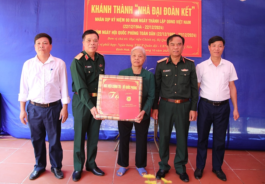 | Lãnh đạo Học viện Chính trị và đại diện cấp ủy, chính quyền xã Phượng Tiến trao quà và bàn giao "Nhà đại đoàn kết” tặng gia đình bà Ma Thị Hòa, xã Phượng Tiến (Định Hóa, Thái Nguyên). |