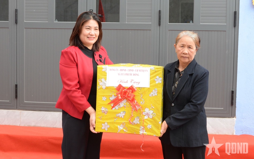 Chuẩn đô đốc Đỗ Văn Yên và các đại biểu dự bàn giao nhà cho gia đình bà Nguyễn Thị Mỹ Lệ.