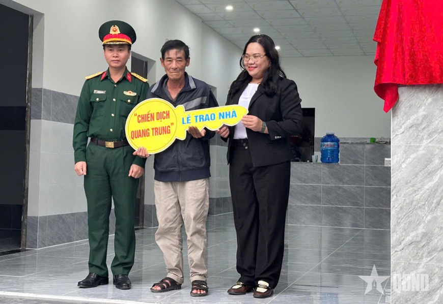 | Đại diện Lữ đoàn Tăng 273 (Quân đoàn 34) và địa phương trao chìa khóa tượng trưng cho hộ gia đình ông Phạm Ngọc Chấn, thôn Lộc Hà, xã Tuy Phước, tỉnh Gia Lai. |