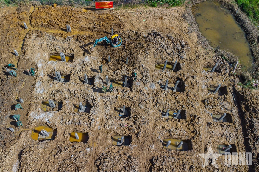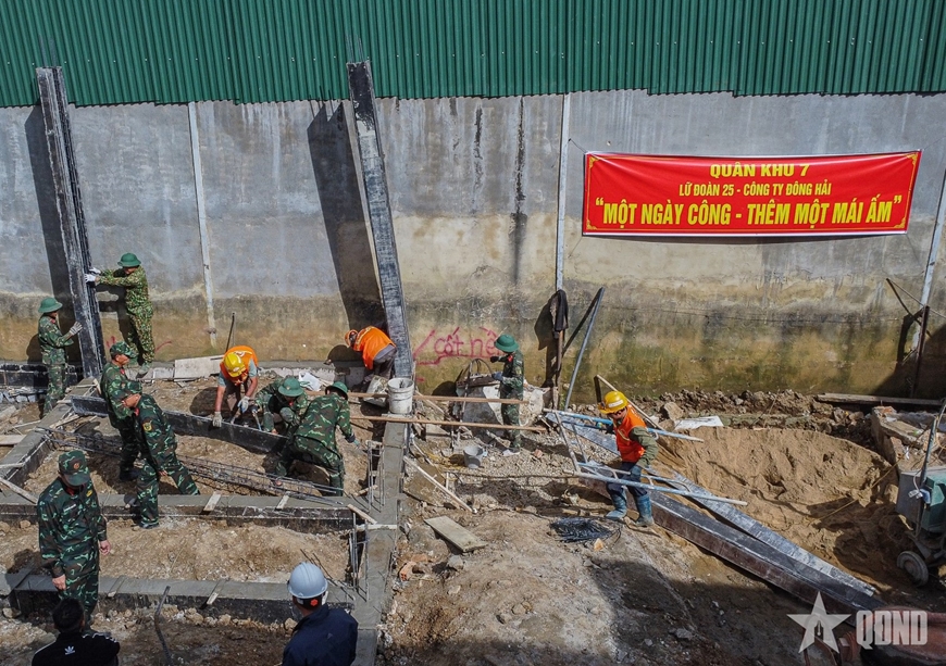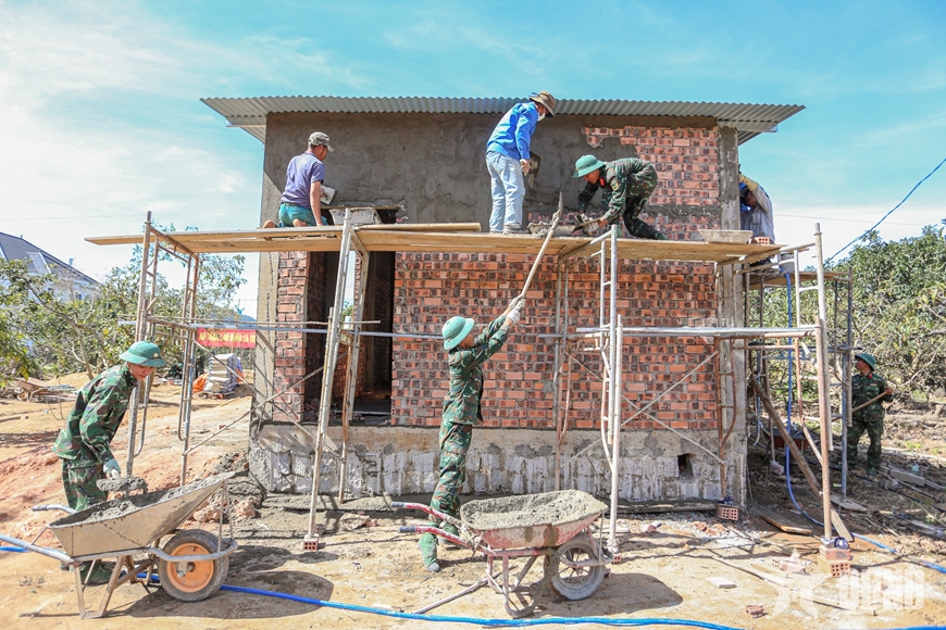 Hàng trăm cán bộ, chiến sĩ cùng với các lực lượng địa phương đã không quản ngại nắng mưa, tranh thủ từng phút, từng giờ để trộn bê tông, xây tường, đổ trụ... Mỗi người một nhiệm vụ, cùng phối hợp chặt chẽ, khoa học, kỷ luật, bảo đảm chất lượng từng hạng mục. Tất cả vì mục tiêu bà con có nhà mới trước Tết Nguyên đán Bính Ngọ 2026.