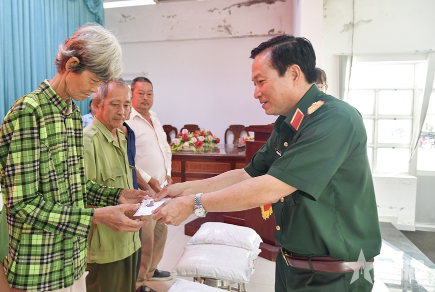 Tại nơi đến, Thiếu tướng Nguyễn Minh Triều, Phó tư lệnh Quân khu 9 ân cần thăm hỏi sức khỏe, động viên các gia đình chính sách, hộ nghèo; trao tặng 150 phần quà; mỗi phần quà trị giá hơn 600.000 đồng.