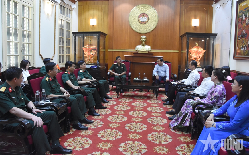 Đồng chí Nguyễn Phi Long, Ủy viên dự khuyết Trung ương Đảng, Phó bí thư Đảng ủy Mặt trận Tổ quốc, các đoàn thể Trung ương (thứ ba, từ phải sang) trao Thư cảm ơn đến Quân ủy Trung ương, Bộ Quốc phòng. |