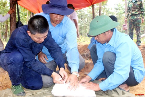 Đội TKQT HCLS 584, Bộ CHQS tỉnh Quảng Trị, quy tập HCLS tại bản Bừng Thạ Lê, huyện Phà Lan Xai (Sa Vẳn Na Khẹt, Lào), tháng 12-2017. Ảnh: LÊ THẮNG