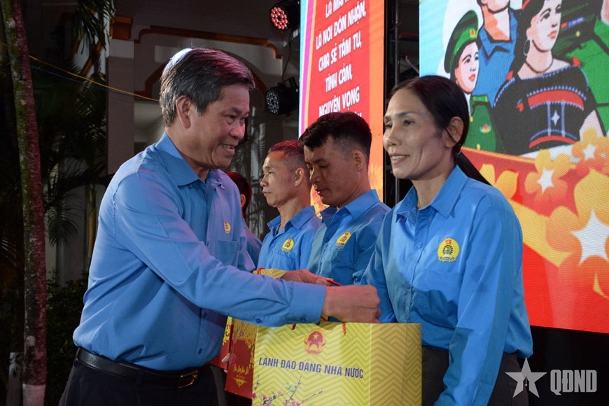 | Đại tá Nguyễn Văn Đề, Trưởng ban Công đoàn Quốc phòng trao quà tặng gia đình đoàn viên công đoàn. |