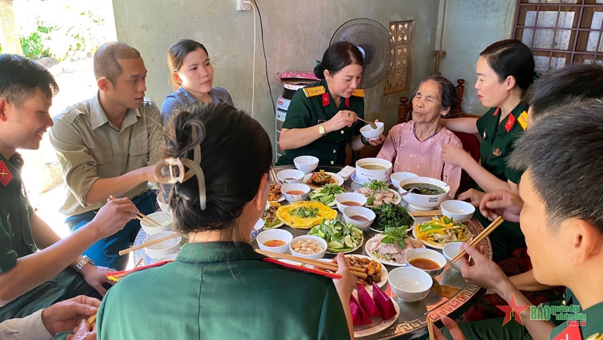 Hội Phụ nữ, Đoàn Thanh niên Bộ CHQS tỉnh Quảng Trị tổ chức bữa cơm tri ân cùng Bà mẹ Việt Nam anh hùng Nguyễn Thị Nậy. Ảnh: Kim Quy