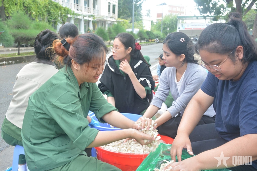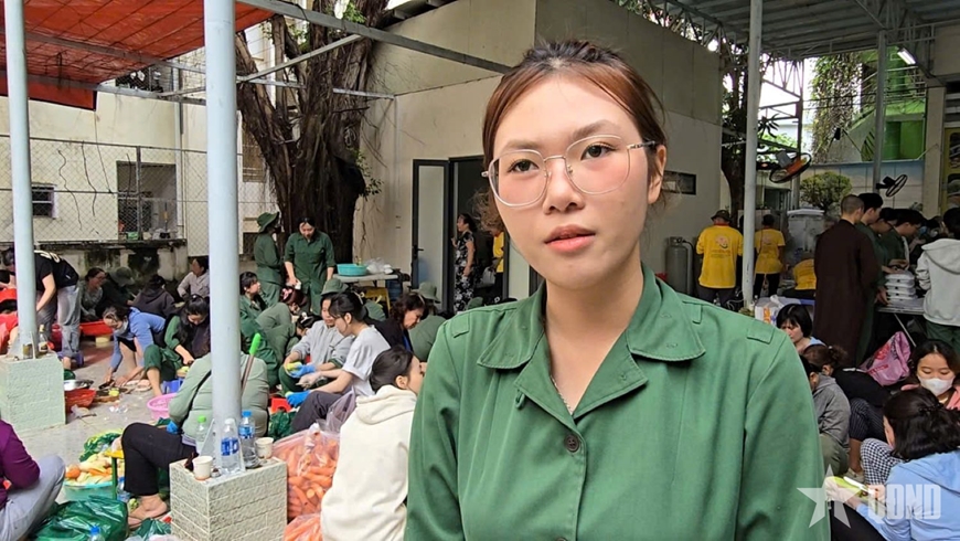 Em Huỳnh Thị Ngọc Châm, sinh viên năm thứ hai, Lớp Quản trị Du lịch và Lữ hành, Trường Đại học Khánh Hòa, chia sẻ: “Từ ngày hôm qua đến nay, em đã tham gia chuẩn bị cơm, nước uống và những phần bánh mang đến cho bà con vùng lũ. Em muốn góp một phần sức của mình để giúp đỡ bà con vượt qua giai đoạn khó khăn này”.