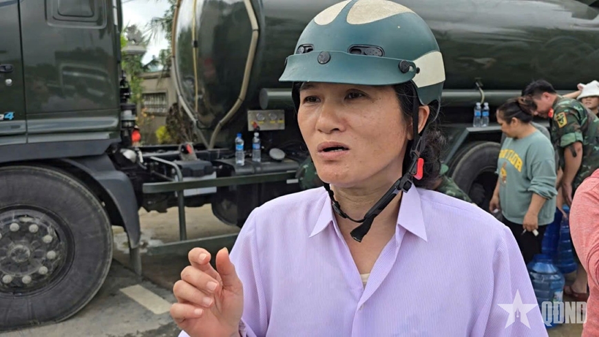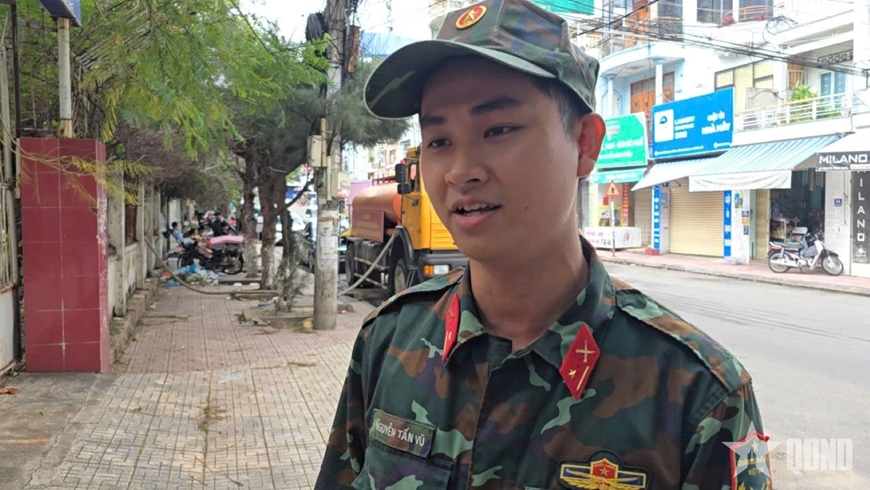 Thiếu úy QNCN Nguyễn Tấn Vũ, nhân viên Ban Dân quân, Phòng Tham mưu, Bộ CHQS tỉnh Khánh Hòa, kể: “Để cấp nước cho Trường Đại học Nha Trang nấu cơm cho bà con vùng lũ, cũng như bảo đảm nước sinh hoạt cho người dân phường Bắc Nha Trang, chúng tôi đã làm liên tục 2 ngày nay”.