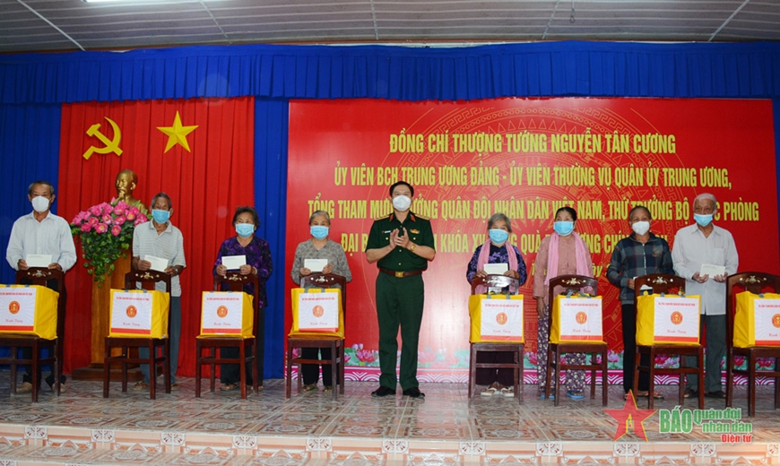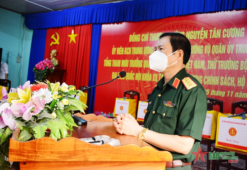 Phát biểu chia sẻ khó khăn với bà con xã Tân Mỹ (huyện Bắc Tân Uyên), Thượng tướng Nguyễn Tân Cương nhấn mạnh: Những năm qua, Bộ Quốc phòng luôn thực hiện tốt phong trào “Đền ơn đáp nghĩa”, quan tâm, chăm lo đời sống vật chất, tinh thần cho gia đình chính sách, người có công, hộ nghèo trong cả nước; hỗ trợ các địa phương phát triển an sinh xã hội. Trong đợt dịch Covid-19 lần thứ tư, cán bộ, chiến sĩ lực lượng vũ trang đã tích cực tham gia chống dịch giúp dân với tinh thần “chống dịch như chống giặc”, “tính mạng, sức khỏe của nhân dân trên hết, trước hết”. Đây là những hoạt động thiết thực tham gia cùng địa phương ngăn chặn, đẩy lùi dịch bệnh…
