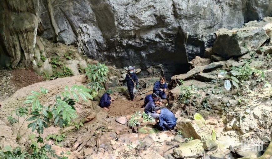 Cán bộ, chiến sĩ Đội Quy tập mở rộng tìm kiếm tại khu vực hang núi Chia, hang Chia, núi Hin Đăm (bản Hin Đăm cũ) nay thuộc bản Noong Pát, huyện Viêng Thoong.