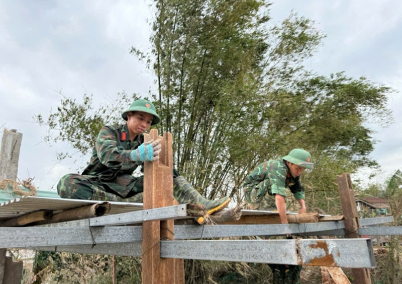 Các hộ dân có nhà bị đổ sập hoàn toàn được bộ đội dựng nhà tạm.