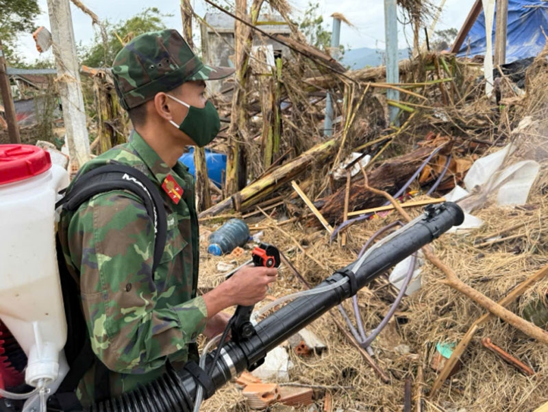 | Các chiến sĩ tiến hành phun khử khuẩn, bảo vệ môi trường tại các hộ dân. |