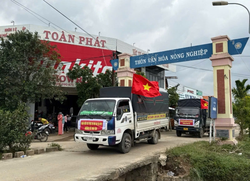 Xe chở hàng cứu trợ từ các tỉnh, thành phố trên đường vào xã Hòa Thịnh, tỉnh Đắk Lắk.