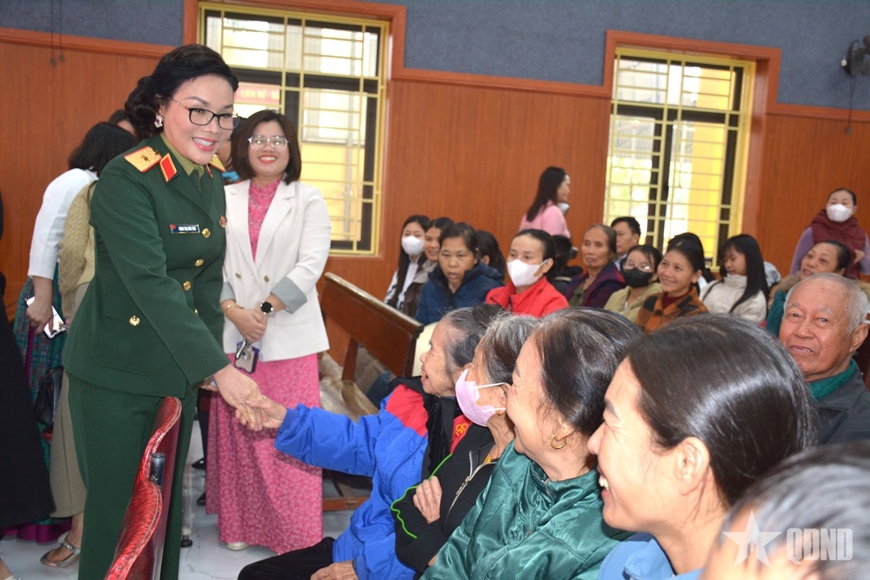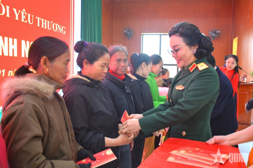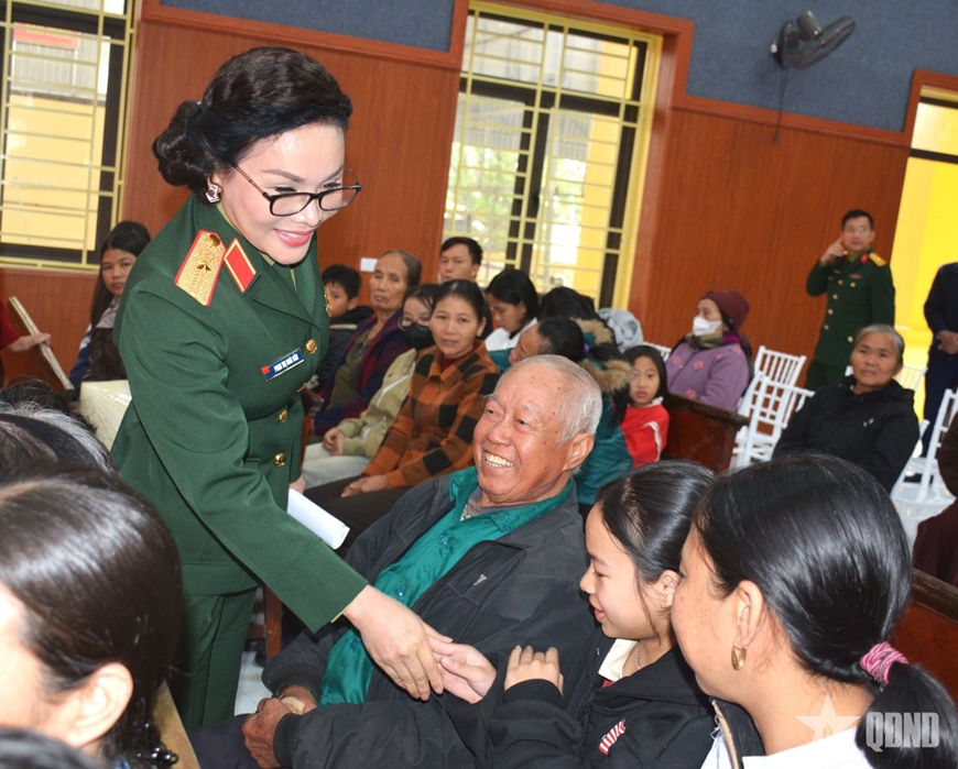 | Thiếu tướng Phan Thị Hoài Vân trao quà Tết tặng bà con xã Quan Thành. |