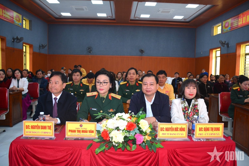 | Thiếu tướng Phan Thị Hoài Vân, Phó chủ nhiệm Tổng cục Công nghiệp Quốc phòng cùng các đại biểu tại buổi trao quà tặng bà con xã Quan Thành. |