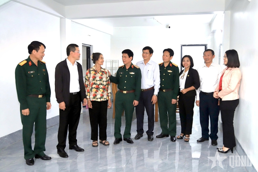 | Đoàn công tác Tổng cục Hậu cần-Kỹ thuật cùng cấp ủy, chính quyền địa phương động viên bà Nguyễn Thị Hiền trong căn nhà mới. |
