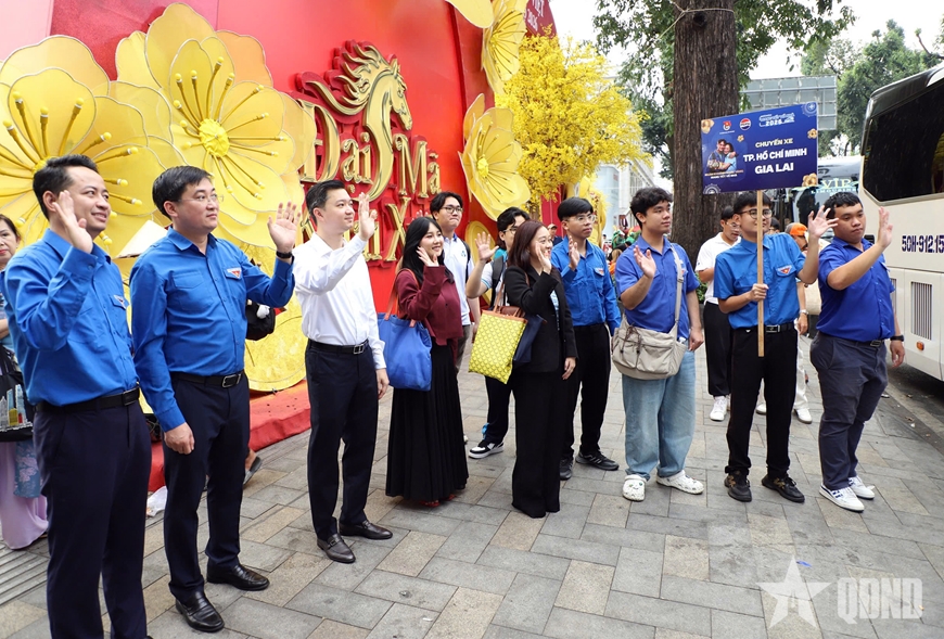 | Đại diện ban tổ chức, tuổi trẻ TP Hồ Chí Minh tiễn sinh viên, người lao động về quê đón Tết. |