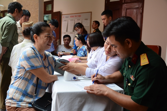 Cán bộ, nhân viên Cục Hậu cần, Tổng cục Chính trị khám bệnh, tư vấn sức khỏe cho người có công phường Hàng Mã (Hoàn Kiếm, Hà Nội). |