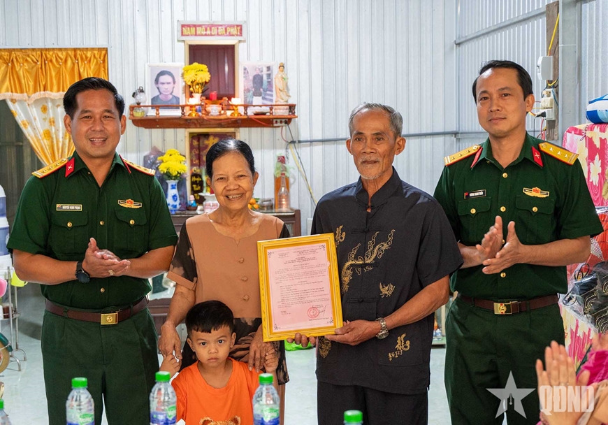 Đại diện Phòng Dân vận Quân khu 9 và Bộ CHQS tỉnh An Giang trao quyết định tặng nhà.