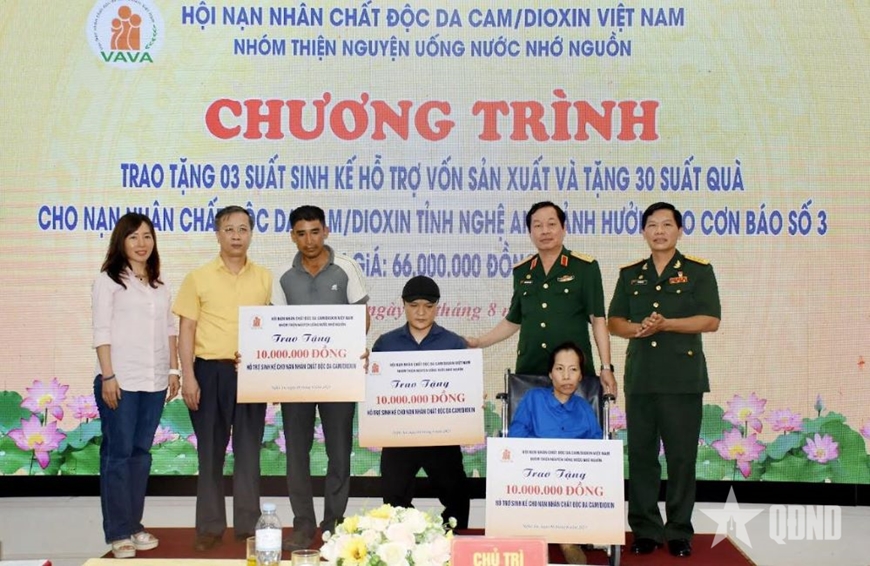 Tại tỉnh Nghệ An, lãnh đạo Hội Nạn nhân chất độc da cam/dioxin Việt Nam cùng đại diện Nhóm thiện nguyện Uống nước nhớ nguồn đã trao tặng 3 suất sinh kế, hỗ trợ vốn sản xuất và trao 30 suất quà (tổng trị giá 66 triệu đồng) tặng nạn nhân chất độc da cam bị ảnh hưởng bởi cơn bão số 3.