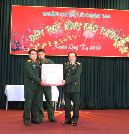 | Trung tướng Mai Quang Phấn tặng quà cho tuổi trẻ Lữ đoàn 144. |