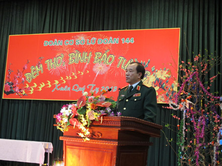 Thay mặt lãnh đạo Tổng cục Chính trị, Trung tướng Mai Quang Phấn biểu dương những thành tích mà cán bộ, chiến sĩ Lữ đoàn 144 đã đạt được trong năm qua. Nhân dịp năm mới, đồng chí chúc cán bộ, chiến sĩ Lữ đoàn 144 nói riêng, thanh niên quân đội nói chung luôn đoàn kết, phát huy sự xung kích của tuổi trẻ, xứng đáng với danh hiệu Bộ đội Cụ Hồ làm những nhiệm vụ đặc biệt trong tình hình hiện nay được Bộ Tổng tham mưu giao phó, hoàn thành tốt mọi nhiệm vụ được giao.