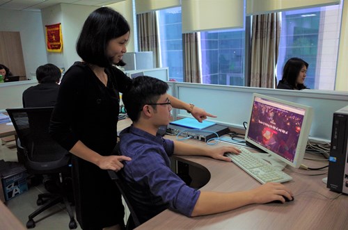 Nhân viên Viện Công nghiệp phần mềm và nội dung số Việt Nam đang kiểm tra chức năng tra cứu thông tin liệt sĩ trên website. |