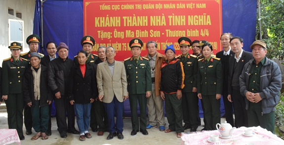 Đoàn công tác Cơ quan Tổng cục Chính trị và lãnh đạo địa phương cùng gia đình ông Ma Đình Sơn trong ngày khánh thành nhà tình nghĩa. |