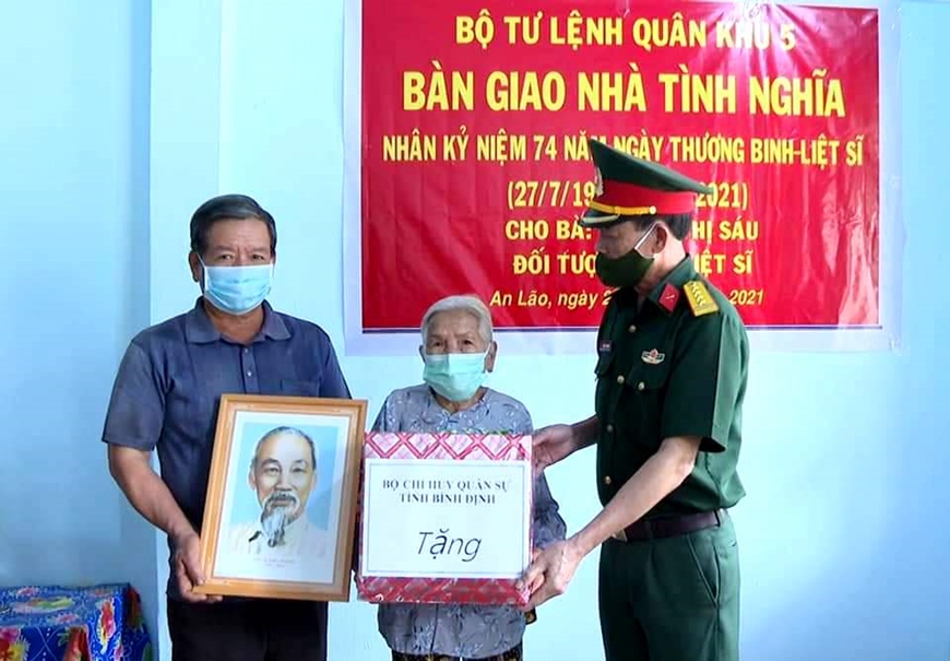 | Thừa ủy quyền của Bộ tư lệnh Quân khu 5, đại diện Bộ CHQS tỉnh Bình Định trao quyết định nhà tình nghĩa, trao quà tặng gia đình bà Huỳnh Thị Sáu, là mẹ liệt sĩ ở xã An Hòa, huyện An Lão, tỉnh Bình Định (Ảnh: TUYÊN HUẤN). |