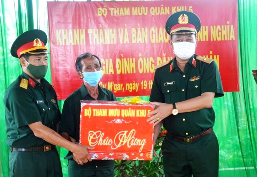 Trong những năm qua, các cơ quan, đơn vị trong toàn quân khu đã sát cánh cùng cấp ủy, chính quyền địa phương tham gia huy động nhiều nguồn lực xây dựng nhà tình nghĩa. Chỉ tính từ năm 2017 đến 2021, Quân khu 5 đã xây dựng và bàn giao 657 nhà tình nghĩa với số tiền hơn 47 tỷ đồng; sửa chữa, nâng cấp 35 nhà tình nghĩa. Quân khu còn trích gần 400 triệu đồng lập 116 sổ tiết kiệm tình nghĩa, mỗi năm trích từ 8 đến 10 tỷ đồng mua quà tặng người có công trên địa bàn.