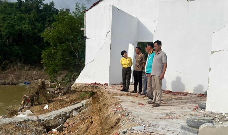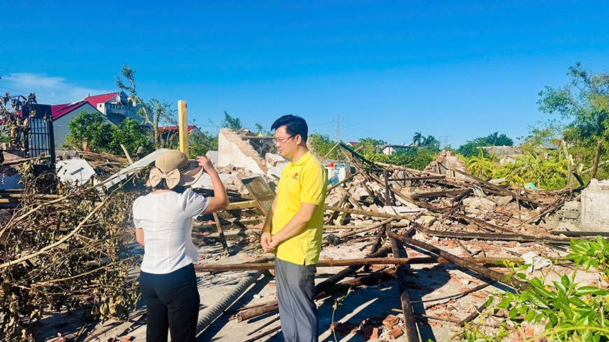 | Đại diện Quỹ Thiện Tâm khảo sát hỗ trợ người dân sập nhà tại tỉnh Nghệ An sau bão số 11. |