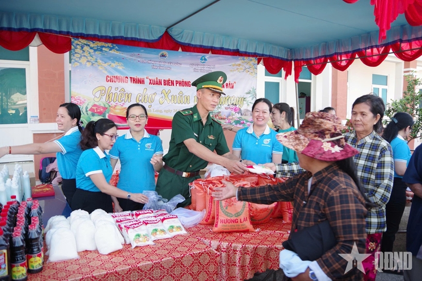 | “Phiên chợ xuân yêu thương” được BĐBP tỉnh Vĩnh Long tổ chức cho bà con nghèo. |
